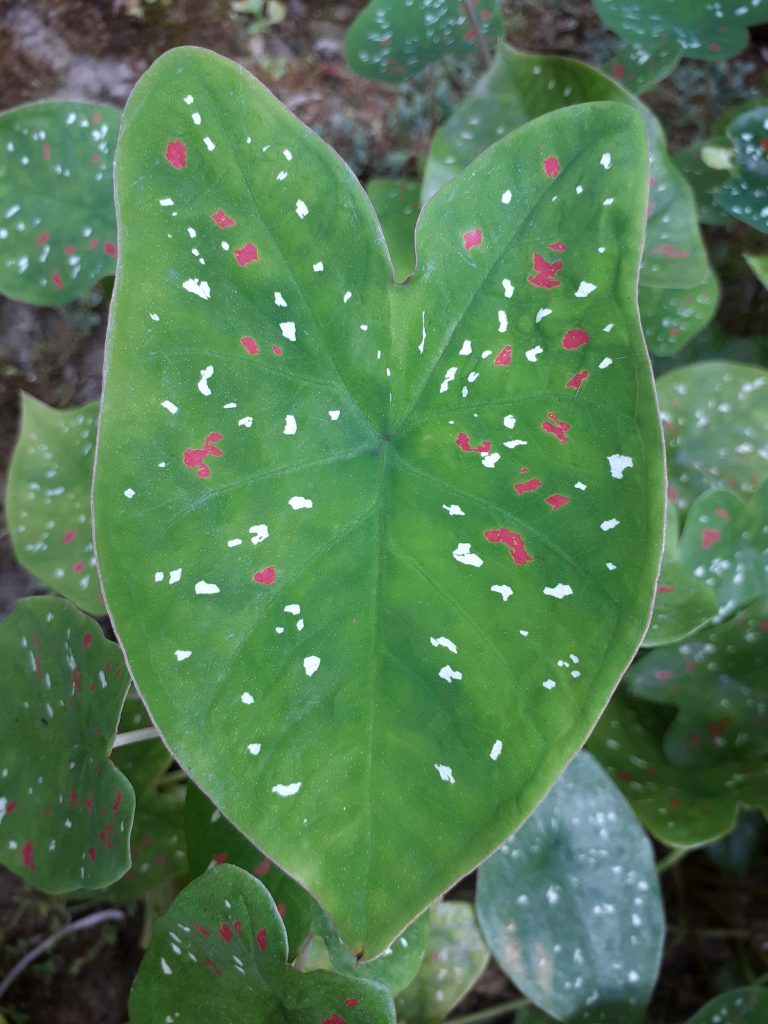 Le Caladium est une plante vivace tubéreuse, tout comme ses proches cousins que sont les Alocasia et les Colocasia. Le tubercule souterrain est l’organe principal de cette plante, puisque c’est grâce à lui qu’elle accumule toute l’énergie et les réserves nutritives indispensables à sa subsistance. De ce tubercule émergent les longues feuilles pouvant atteindre la belle taille de 40 cm de long dans les conditions les plus propices.