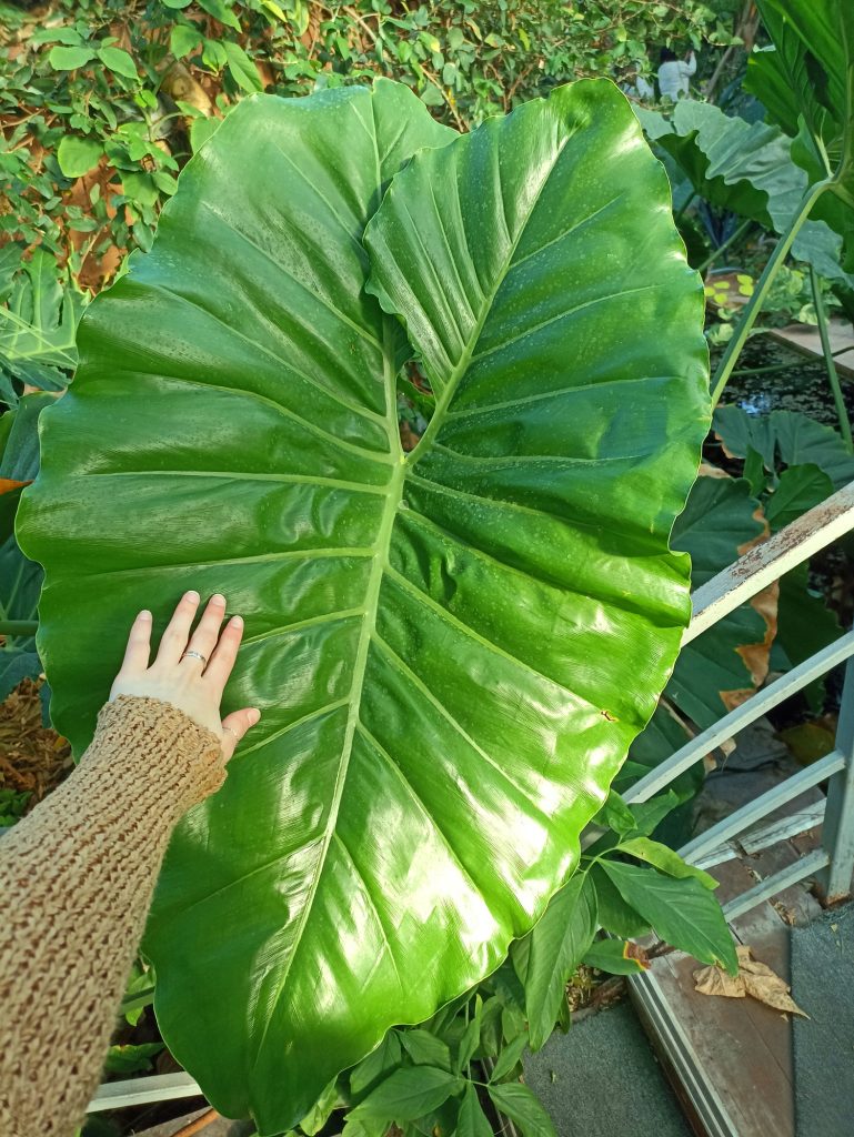 Ces grosses feuilles sont portées au bout d’une grande tige appelée pétiole et qui émerge directement du gros rhizome racinaire. Elles sont vertes, charnues et épaisses, largement nervurées et brillantes.