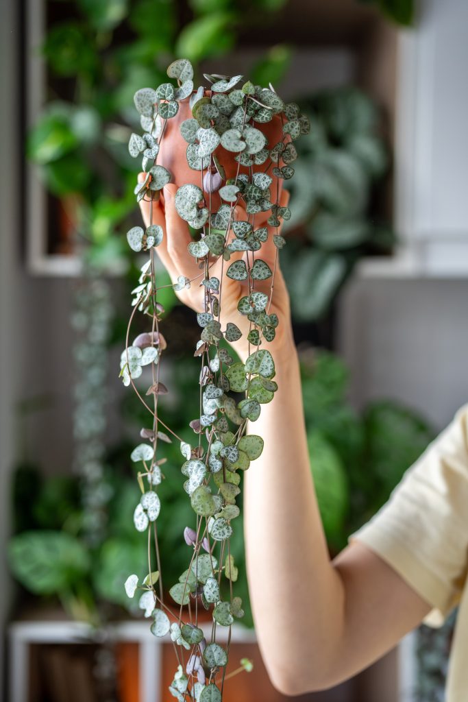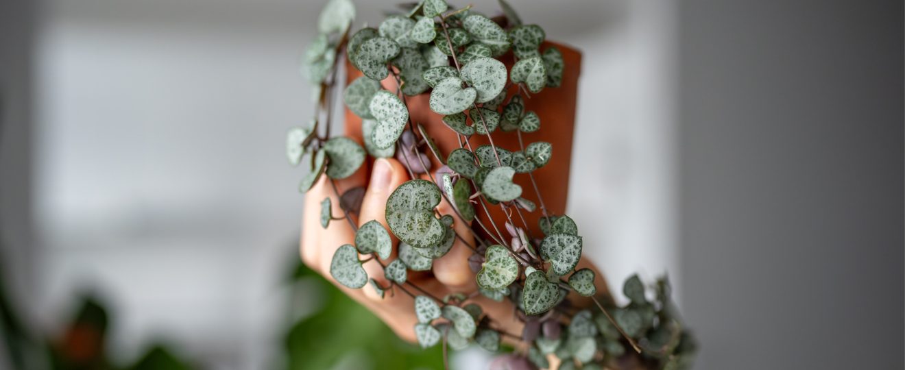 Le Ceropegia woodii est plus connu sous son nom vernaculaire. Il lui vient de la forme si particulière de ses feuilles, représentant de petits cœurs agencés le long de tiges fines, comme le serait une chaîne et ses maillons. D’autres l’appellent sous son second nom de « plante lanterne ». Ici, il fait référence à sa floraison, qui se dévoile sous la forme de petites cages similaires à des lampions lumineux. Le Ceropegia appartient à la famille des Apocynacées, au même titre que les Hoya, eux aussi célèbres pour leurs feuilles en forme de cœur.