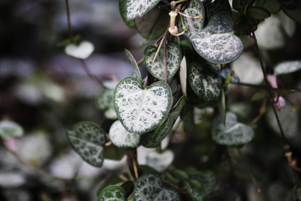 Les feuilles sont de petite taille, opposées sur l’ensemble des tiges, et présentent une jolie forme de cœur. Leur couleur dominante est le vert, mais elles sont largement marbrées d’argenté, avec un revers teinté de violet. L’ensemble offre un contraste tout à fait unique et particulièrement décoratif. Il existe également une variante panachée, appelée Ceropegia woodii ‘Variegata’, dont le feuillage se couvre de rose aléatoirement sur le dessus de chaque feuille : une petite pépite à découvrir !