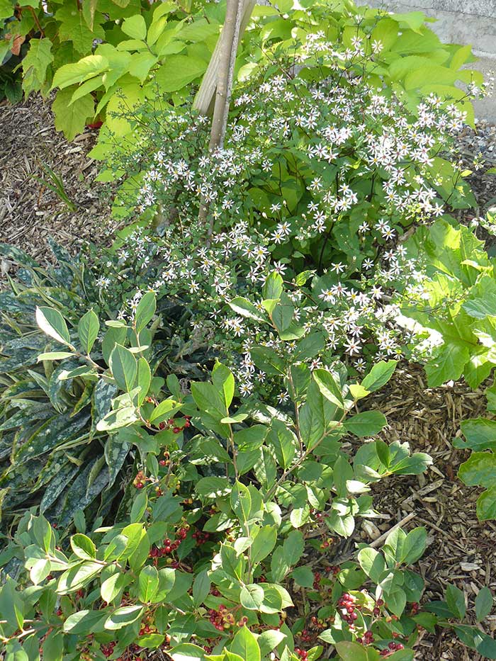 Sur l’illustration précédente vous pouvez voir sur la gauche la pulmonaria longifolia ‘rasberry splash’ en compagnie d’un aronia, un aster, une acanthe dorée, un hydrangea à feuilles de Chêne et d’une aronie ‘sun king’.